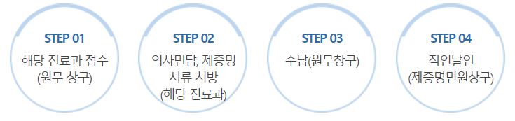 증명서 발급 절차는 해당 진료과 접수 > 의사 면담 > 납부 > 소인 순으로 진행되며, 입원 중 발급을 원하실 경우 해당 진료과 간호사에게 신청하시면 됩니다. 지자체에서 받고 받습니다. 진료 후 발급을 원하실 경우 의사와 상담 후 수령 시 발급받으실 수 있습니다. 입원 및 퇴원 증명서, 외래 진료 증명서는 원무과에서 발급하며, 신체검사 또는 군진단서 발급 시 신분증과 명함 반쪽 사진 2매를 지참해야 합니다. 기타 서류에 대한 문의사항은 민원실(02-3400-1157)로 문의하시기 바랍니다. 대리인이 발급받기를 원하는 경우에는 환자의 사전동의서, 위임장, 대리인의 신분증이 필요합니다.