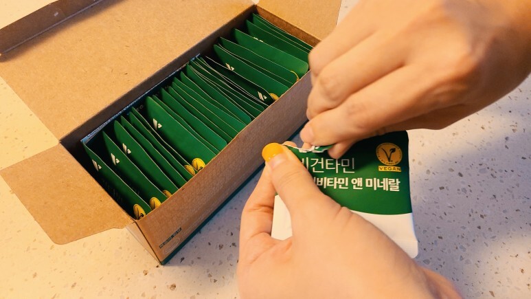 개별포장으로 보관과 휴대가 간편하고 더 나은 비건 식물성 멀티비타민&미네랄 이 제품은 식약처로부터 기능성과 안전성을 인정받은 비타민 10종&미네랄 7종의 기능성 원료 17종이 들어있어 필수 영양소를 부족함 없이 채워줍니다.식사만으로는 부족할 수 있는 비타민과 미네랄을 골고루 섭취할 수 있기 때문에 정말 간편하게 하루의 활력을 충전할 수 있을 것 같습니다.