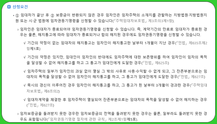 즉, 임대차등기명령을 신청함으로써 계약만료 후 보증금이 반환되지 않더라도 다음 사항에 대한 권리를 취득하게 됩니다. 1. 기존 임대주택에 대한 저항 유지2.보증금 환급 우선순위 임대차등기명령 신청요건