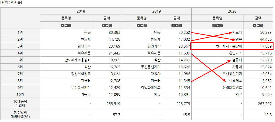 수입품 상위 10위를 보면 눈에 띈다. 2019년에는 반도체 제조 장비의 가동 중단이 체감되고 있습니다.