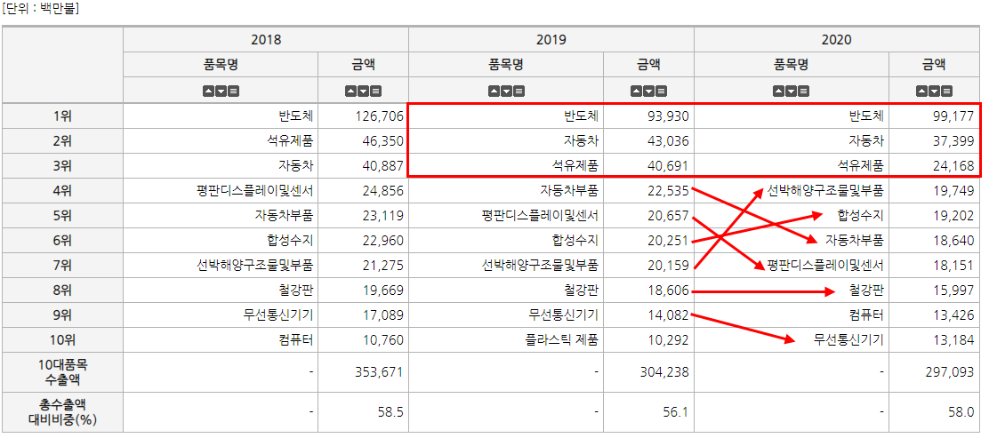 한국의 10대 수출품 순위