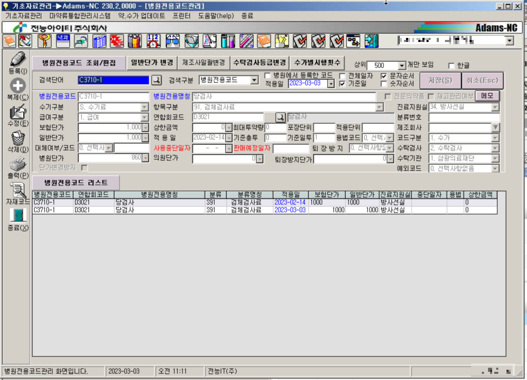 Adams – 기본 데이터 관리 – 검색어에 따른 코드 검색 – 잘못된 코드 분류 수정