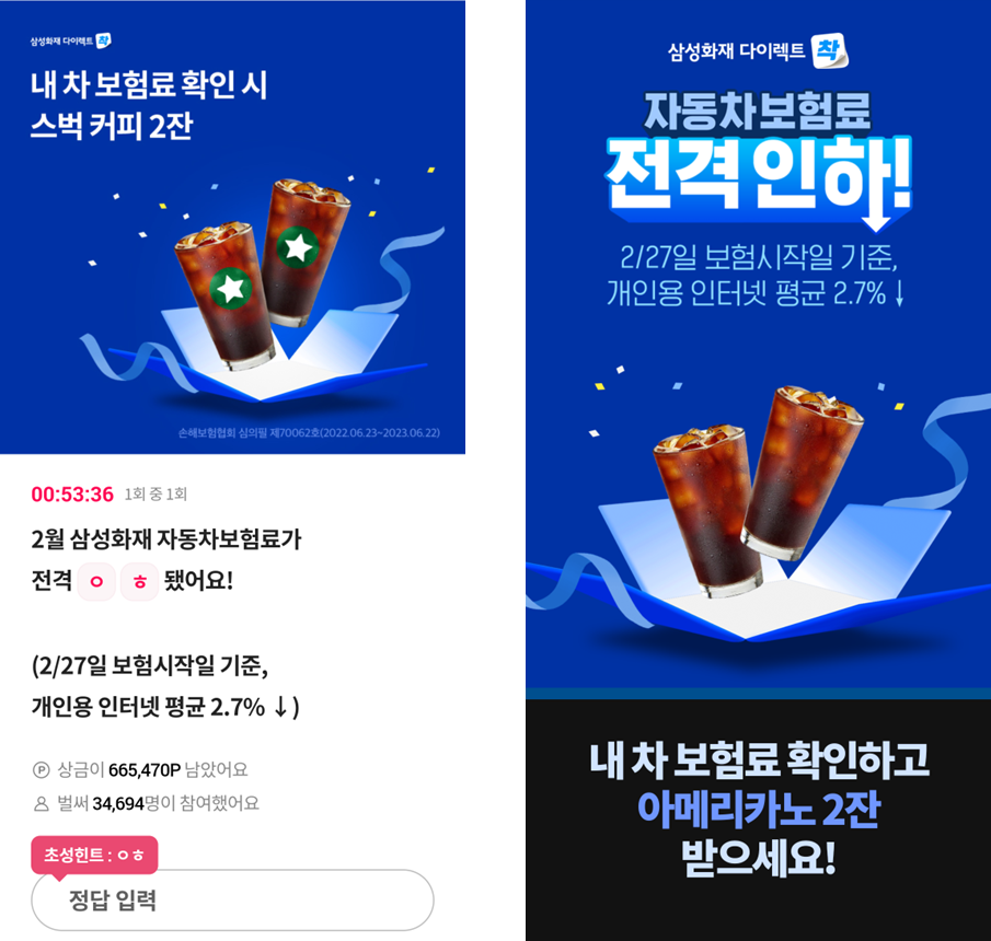 OK캐쉬백 오!퀴즈 (2023년 3월 21일) 챌린지 2023년 03월 21일 by issue OK캐쉬백 오퀴즈 삼성화재 다이렉트자동차보험도전! 초성을 추측할 수 있지만 정답을 확인하려면 힌트 보기를 누르세요. 지금 제출하고 5p를 받으세요! '추천 관련글, 2023년 2월 21일 화요일 마감(헐카롱) 2023.02.15 오퀴즈※4월 26일 카카오뱅크 굿모닝 챌린지 시즌2